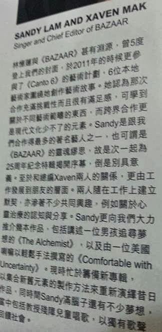 *消息來源:Haper's Bazaar十月號,Sandy and Me網站